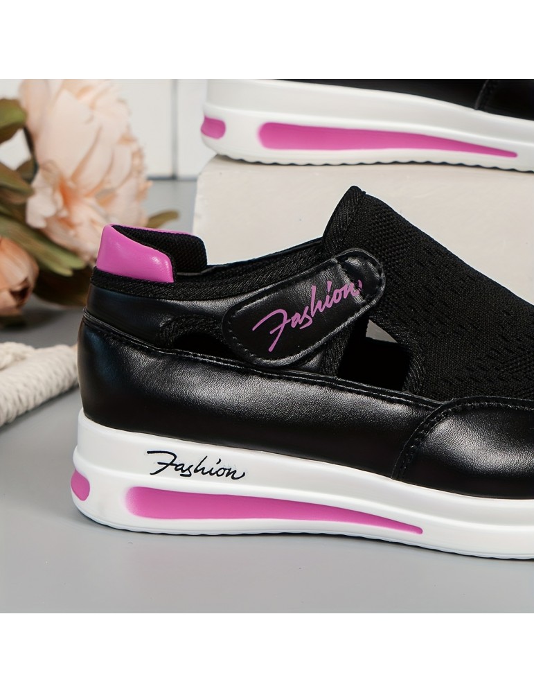 • Women's Breathable Knit Platform Sneakers, Casual Hook & Loop Outdoor Shoes, Comfortable Cutout Shoes