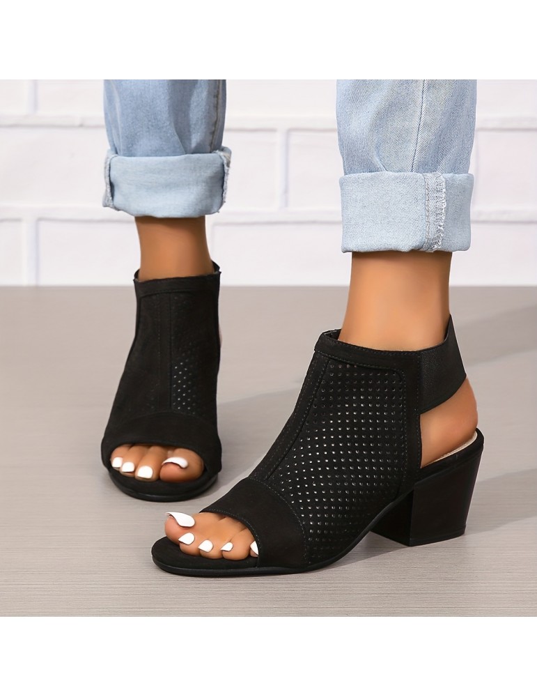 Women's Chunky Heeled Sandals, Peep Toe Perforated Ankle Buckle Strap Mid Heels, Back Zipper Design Sandals Women's Chunky Heeled Sandals, Peep Toe Perforated Ankle Buckle Strap Mid Heels, Back Zipper Design Sandals