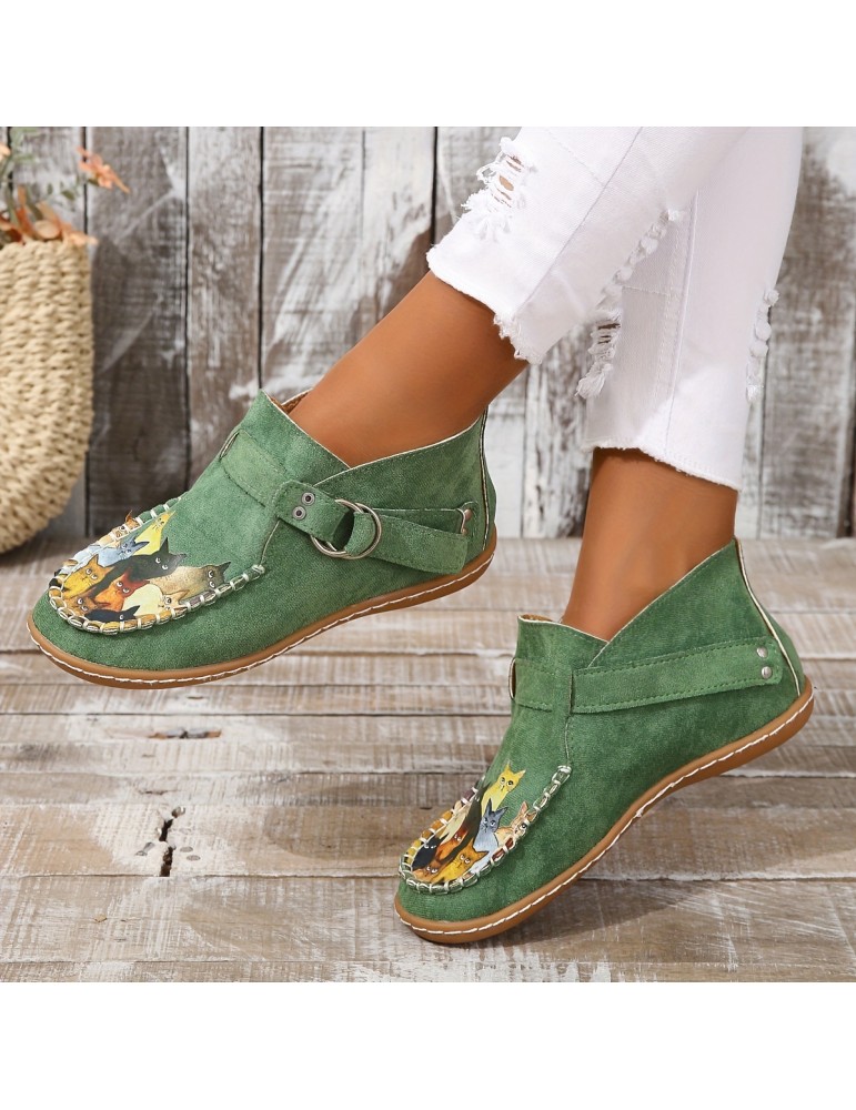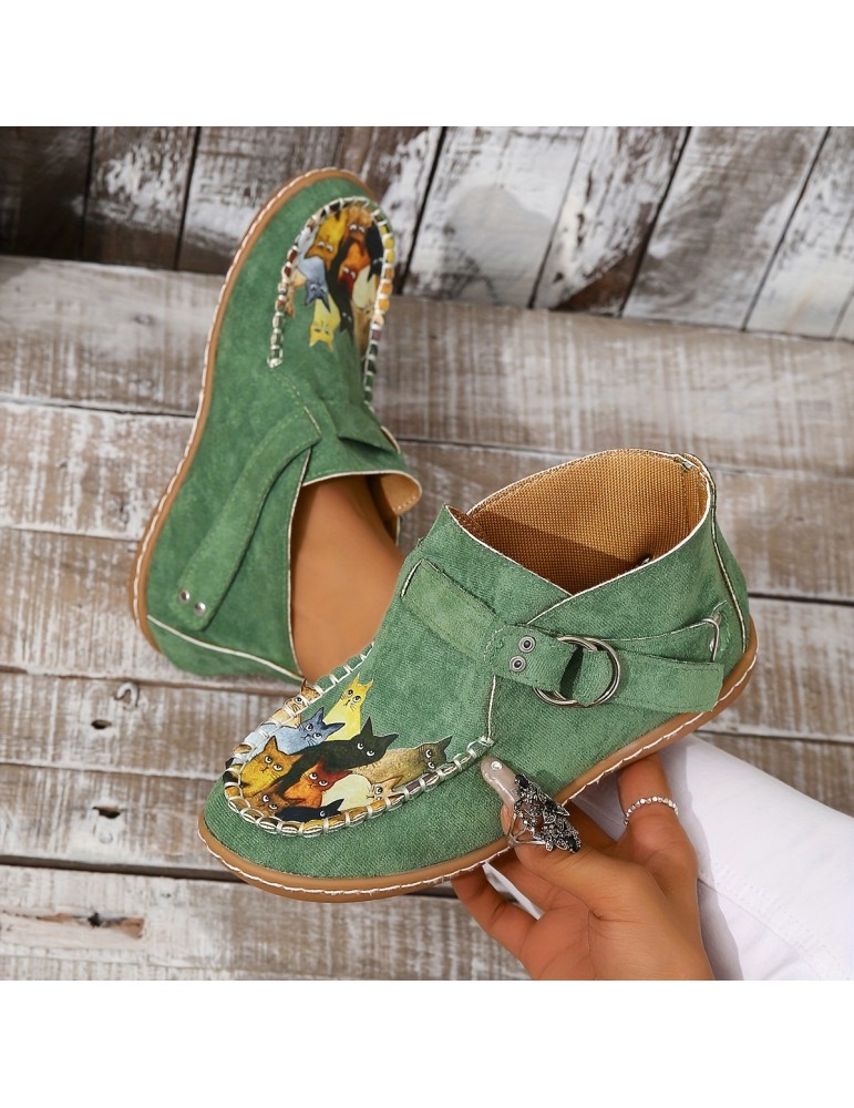 • Women's Cute Cat Pattern Ankle Boots, Retro Round Toe Buckle Slip On Shoes, Comfortable Low Top Shoes
