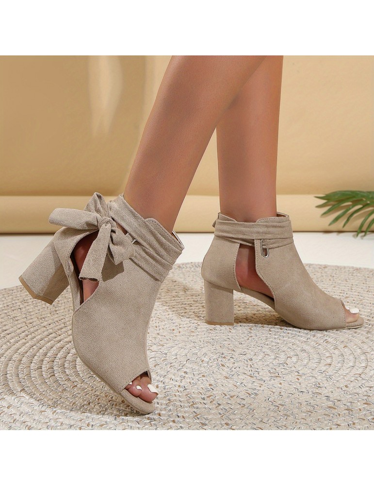 • Women's Bowknot Design Sandals, Peep Toe Side Cut Out Solid Color Chunky Heel Shoes, Summer Holiday Dress Shoes