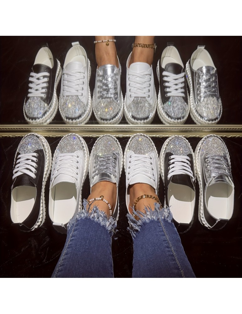 • Women's Rhinestone Flat Sneakers, Fashion Round Toe Lace Up Low Top Skate Shoes, All-Match Outdoor Trainers