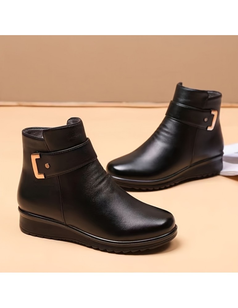 • Women's Winter Plush Lined Ankle Boots, Buckle Detail Side Zipper Warm Boots, Thermal Outdoor Short Boots