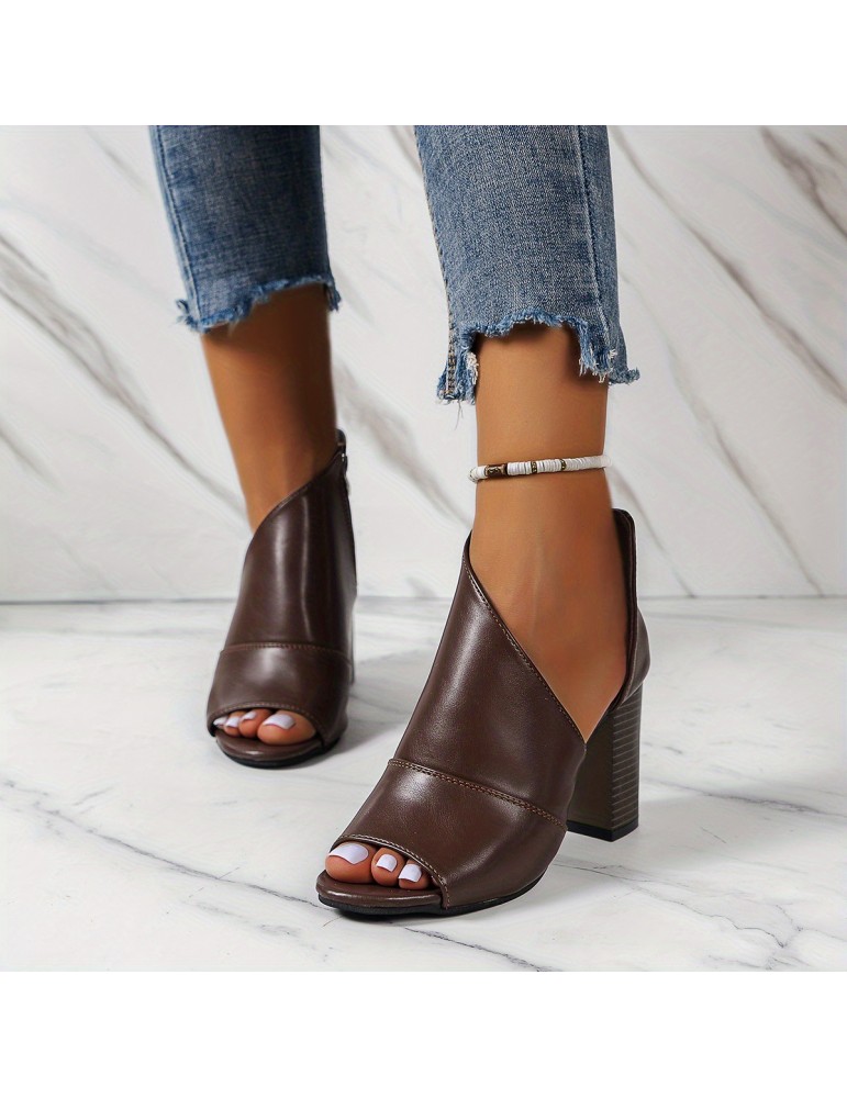 Women's Solid Color Block Heeled Sandals, Casual Open Toe Back Zipper Sandals, Comfortable Summer Heels Women's Solid Color Block Heeled Sandals, Casual Open Toe Back Zipper Sandals, Comfortable Summer Heels