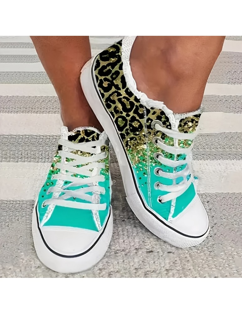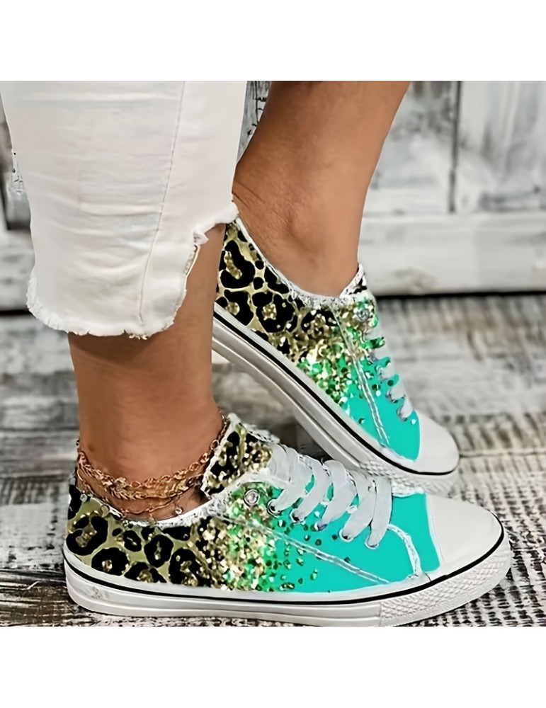 Women's Leopard Print Canvas Shoes, Casual Glitter Sequins Decor Lace Up Shoes, Lightweight Low Top Sneakers Women's Leopard Print Canvas Shoes, Casual Glitter Sequins Decor Lace Up Shoes, Lightweight Low Top Sneakers