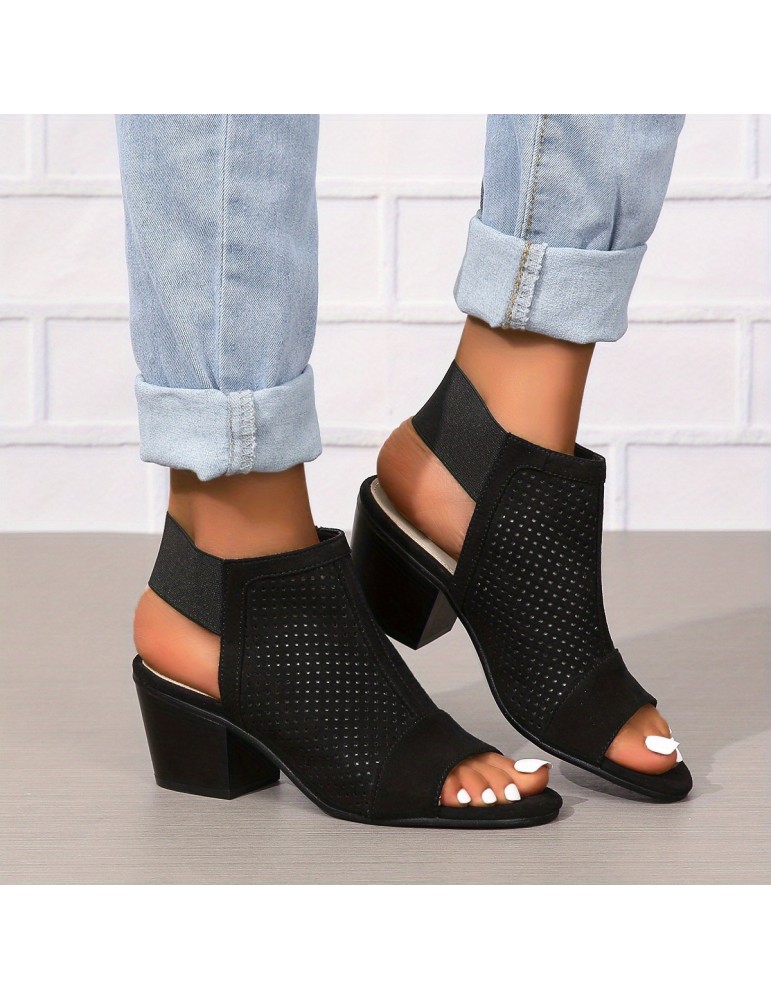 • Women's Chunky Heeled Sandals, Retro Perforated Peep Toe Elastic Strap Slingback Shoes, Solid Color Slip On Sandals