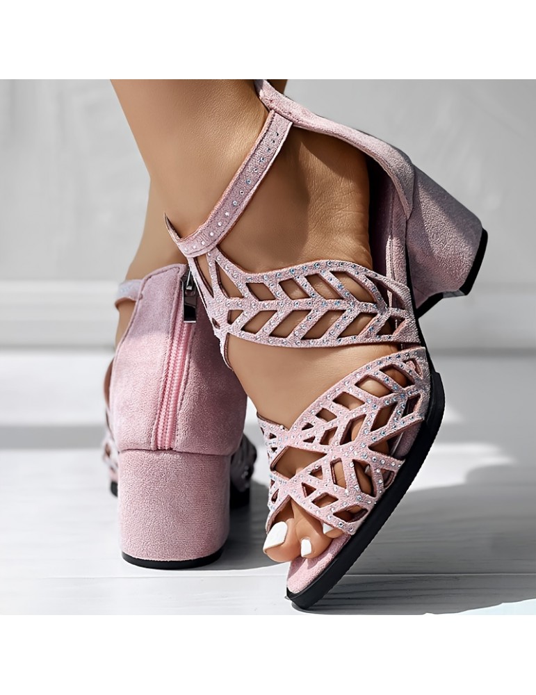 Women's Rhinestone Decor Chunky Heel Sandals, Fashion Hollow Out Design Sandals, Back Zipper Dress Shoes