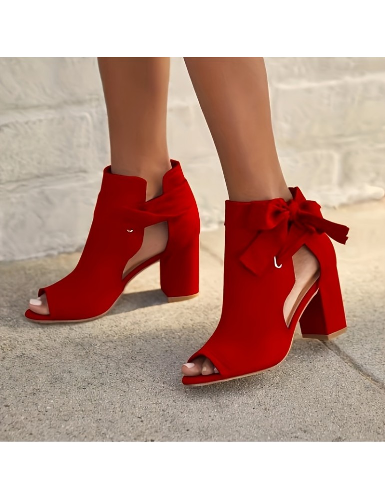 • Women's Bowknot Design Sandals, Peep Toe Side Cut Out Solid Color Chunky Heel Shoes, Summer Holiday Dress Shoes