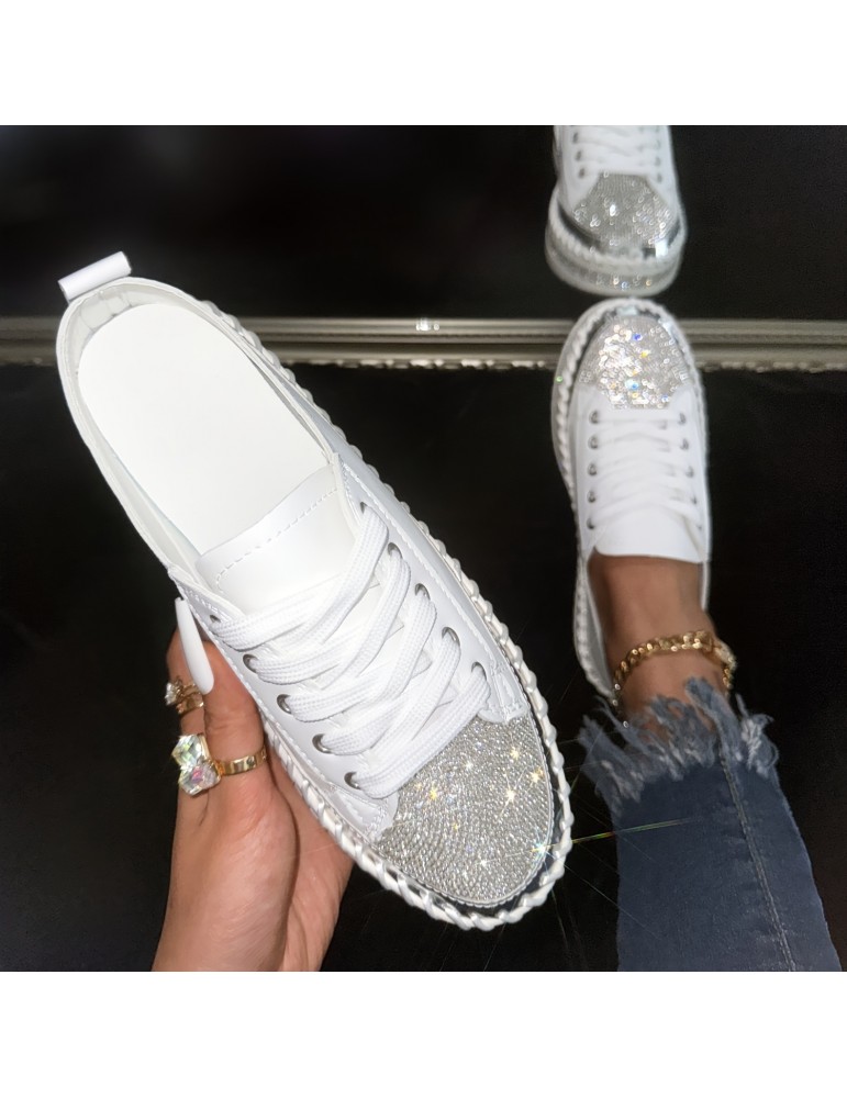• Women's Rhinestone Flat Sneakers, Fashion Round Toe Lace Up Low Top Skate Shoes, All-Match Outdoor Trainers